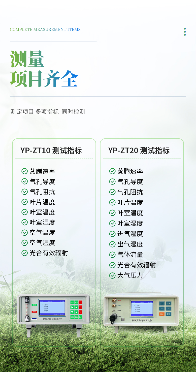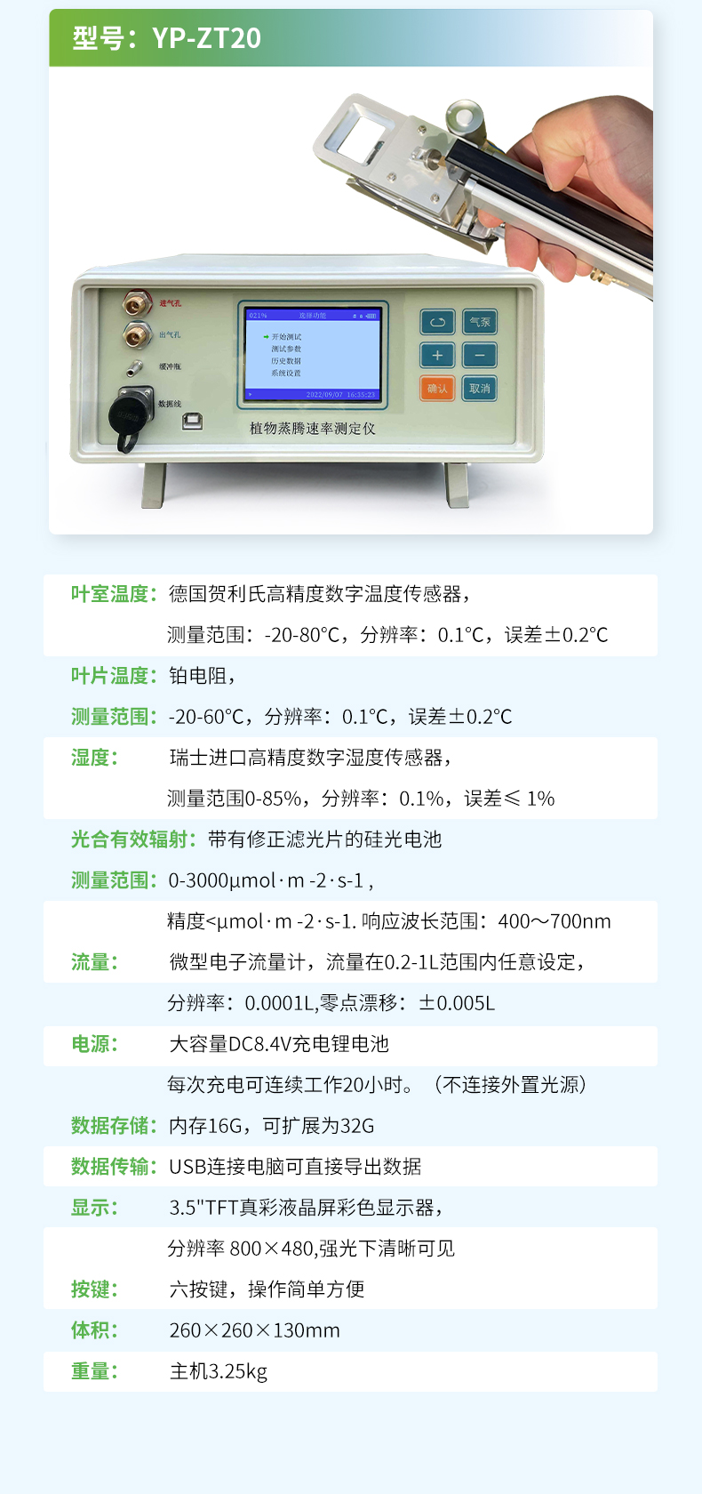【产品简介】蒸腾速率、气孔导度、气孔阻抗、叶片温度、叶室温度、叶室湿度、空气温度、空气湿度、光合有效辐射