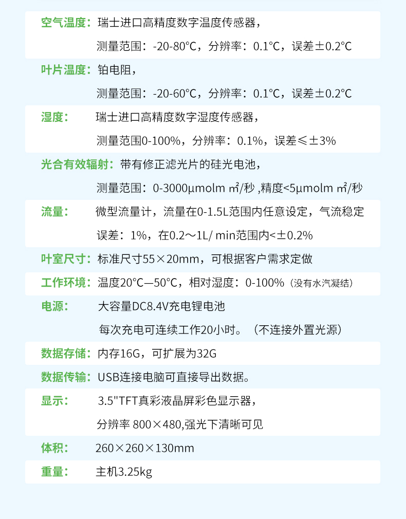【产品简介】蒸腾速率、气孔导度、气孔阻抗、叶片温度、叶室温度、叶室湿度、进气湿度、出气湿度、气体流量、光合有效辐射、大气压力