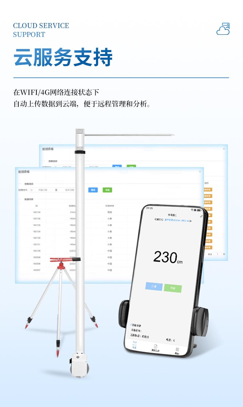 10.广泛应用性 - *低测量高度0.05米,*大测量高度2.6米,适用于大多数类型的农作物株高测量需求。