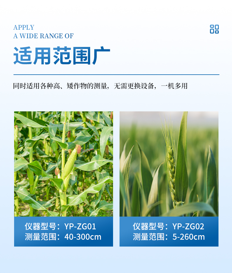 2.适用范围广-可同时适用各种高、矮作物的测量,无需更换设备,一机多用