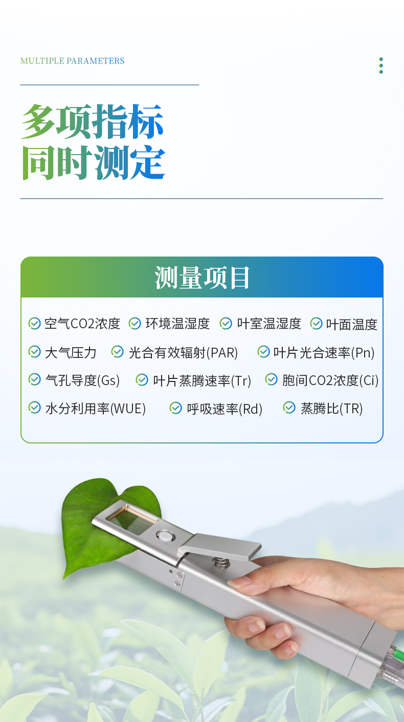 多功能:同时测定光合速率、蒸腾速率、胞间二氧化碳浓度、气孔导度和水分利用效率,以及二氧化碳浓度、相对湿度、光合有效辐射和空气温度、叶片温度十项指标