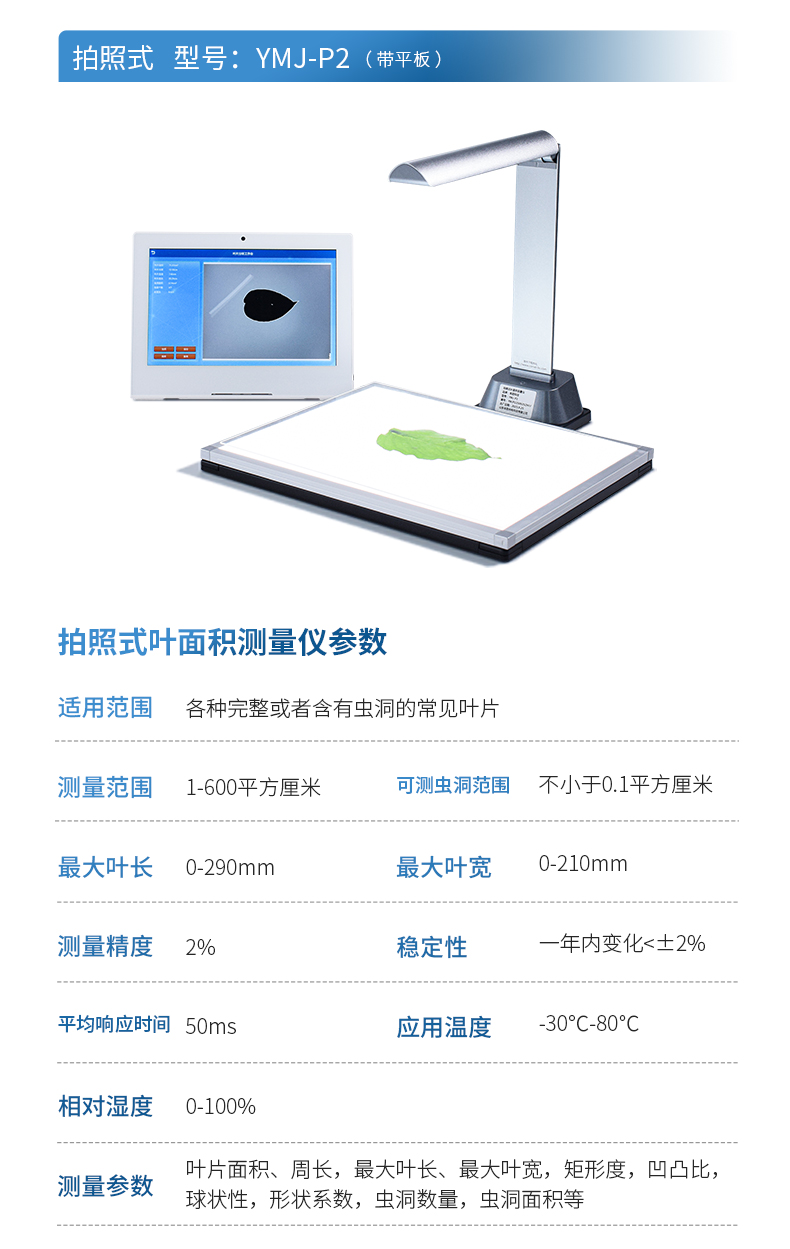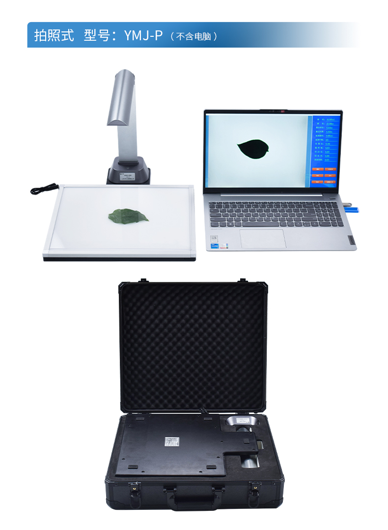拍照式叶面积仪由图像采集设备和图像处理软件组成,采用本公司新开发的图像识别软件,根据叶片轮廓特征提取、图形实物转换、边缘检测等技术,能够形象并快速得到所测叶片面积、周长、虫洞数量等参数。相比传统的叶面积,具有测量更快速简便、结果更形象客观、数据多样并大大减少了人为操作带来的误差。